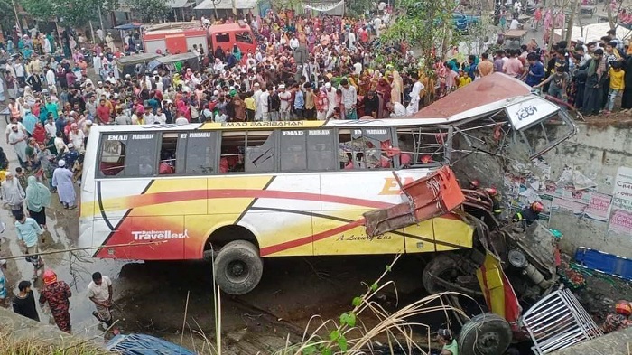 He said the incident occurred around 8 am when a Dhaka-bound bus of Emad Paribahan from Khulna fell into a roadside ditch after its driver lost control over the wheel on the approach road of Padma Bridge in Simana area under Kathalbari union of Shibchar upazila, leaving 14 people including the bus driver dead on the spot.