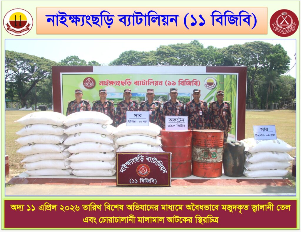Additionally, in the early hours of April 11, BGB seized 395 liters of illegally stored octane from the Sonaichhari area of Naikhongchhari, valued at several lakh taka. At the same time, 20 sacks of urea fertilizer and 4 sacks of TSP fertilizer were seized from the Time Bazar area. Authorities believe these were stockpiled for smuggling purposes.