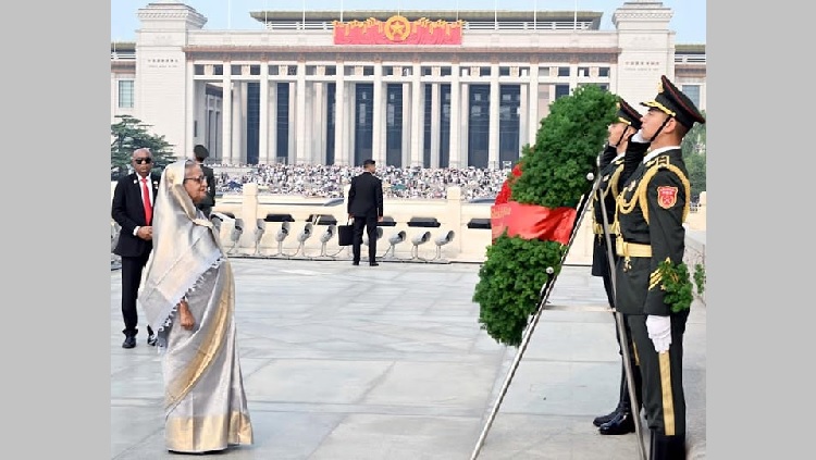 After laying the wreath at the Monument in the afternoon, the prime minister stood in solemn silence for some times as a mark of profound respect to the memory of the Chinese revolutionary heroes. Earlier on her arrival at the square, a smartly turned out contingent of the Chinese Armed Forces gave the Bangladesh premier the state salute. The prime minister is now in Beijing on a four-day bilateral visit to China from July 8 to 11 at the invitation of her Chinese counterpart Li Qiang.