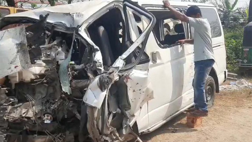Bhaberchar Highway Police Outpost Sub-inspector Riyad said the accident happened around 3:30am when the microbus carrying six persons was heading towards Titas upazila from Hazrat Shahjalal International Airport in Dhaka. When the microbus reached in Gajaria’s Bausia on the highway, the covered van hit the vehicle from behind, a correspondent from Munshiganj reports.